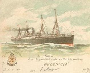 Keywords: Phoenicia Hapag.jpg de Der Dampfer Phoencia der Hapag 1898 http //www schiffe-maxim de/Phoenicia htm author 1898 Hamburg-Amerikanische Packetfahrt-Actien-Gesellschaft Ships built at Blohm + Voss Kronstadt ship 1894 PD-old