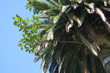 | Keywords: Phoenix-canariensis-with-fig.jpg An increasingly common sight in northern New Zealand A young plant of the Australian banyan-type fig Ficus macrophylla Moreton Bay Fig has started life as an epiphyte on a tall Phoenix canariensis palm in Albert Park Auckland New Zealand The seed from which this plant grew must have been deposited here by a bird that ate the fruit from one of the large Moreton Bay Figs that grow in the area Ficus macrophylla is commonly cultivated in northern New Zealand It has now acquired its pollinating wasp Pleistodontes froggatti apparently by long-distance dispersal The size and vigour of this fig and its lack of natural enemies notably an immunity to possum browsing indicate that it may be able to invade forest and other native plant communities The Moreton Bay Fig has been found growing on both native and introduced trees in Auckland Own 2008-05-17 Kahuroa Kahuroa Phoenix canariensis cultivated Ficus macrophylla Epiphytes Arecaceae in New Zealand Files by User Kahuroa |
