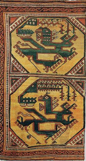 | Keywords: Phoenix and dragon carpet Anatolia first half or middle 15th century.jpg en Date and Origin newly attributed to early 15th c Turkey<ref>According to information on the wall of the Museum fur Islamische Kunst of Berlin</ref> Collection Berlin Museum fur Islamische Kunst I 4; Size 172 cm x 90 cm; Literature King and Sullivan 1983 p 49 ;Notes Often called 'dragon carpets' or even ';Chinese-inspired phoenix-and-dragon' carpets these rugs more likely had Christian symbolic and relic significance both in Armenia and in the West see the dragon motifs on the facade of San Miniato al Monte in Florence a church dedicated to an Armenian prince This carpet was bought by Wilhelm von Bode the fabled director of the Berlin museums in 1886 where it was said to come from a church in central Italy Possibly this church was in Siena Very likely the carpet was considered to be a secondary relic woven by Armenian Christians and brought by eastern refugees to Italy who were fleeing the Ottoman incursions in the East It is similar to the carpet in Domenico di Bartolo's painting of the Marriage of the Foundlings of 1444 in the Scala Hospital Siena http //www flickr com/photos/26911776 N06/2516441061/ 15th century anonymous manufacturer century 15 Armenian rugs and carpets Phoenix Dragons in tapestry Armenia in the 15th century 15th-century carpets Rugs and carpets of Turkey PD-Art-100 |
