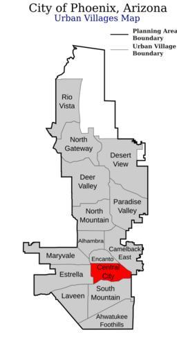 | Keywords: Phoenix Urban Villages Central City highlighted.svg This map shows the Urban Villages within the City of Phoenix ” Maricopa County Arizona Central City Village is highlighted in red I created it in Inkscape using data from the City of Phoenix Website specifically the http //phoenix gov/PLANNING/vplanners pdf Urban Village Planners Map My own work based on government information Though I strove to be as accurate in the detail as possible the information isn't one hundred percent accurate 2008-04-15 Ixnayonthetimmay Public Domain See Category Maps of the Urban Villages of Phoenix Arizona for other versions of this image Central City Village Phoenix 01 Maps of the Urban Villages of Phoenix Arizona Created with Inkscape |