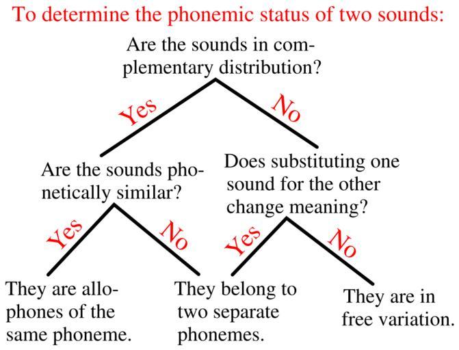 | Keywords: Phoneme-allophone-determination-chart.svg Simplified chart / decision tree to determine whether two sounds which occur in the words of a language are allophones of the same phoneme separate phonemes or in free variation For explanations of terms and procedures see articles Allophone Complementary distribution Minimal pair Free variation and Phoneme The classic example of sounds which are in complementary distribution in a language but which are not usually considered to be allophones of the same phoneme due to phonetic dissimilarity is the sounds h and ŋ in English Self-made graphic converted from the following vector PostScript source code <pre> -40 0 translate 1 0 0 setrgbcolor/Times-Roman 30 selectfont 71 65 moveto 543 0 rlineto 0 414 rlineto -543 0 rlineto closepath stroke gsave 33 69 rotate 365 149 moveto Y show -2 0 rmoveto es show grestore gsave -33 69 rotate 130 510 moveto No show grestore gsave 46 7788 rotate 226 21 moveto Y show -2 0 rmoveto es show grestore gsave -39 5226 rotate 70 322 moveto No show grestore gsave 46 3119 rotate 365 5 -135 moveto Y show -2 0 rmoveto es show grestore gsave -37 4054 rotate 246 432 moveto No show grestore 4 setlinewidth 1 setlinecap/Times-Roman 26 selectfont 85 454 moveto To determine the phonemic status of two sounds show 0 setgray/Times-Roman 24 selectfont 220 419 moveto Are the sounds in com- show 216 392 moveto plementary distribution show 119 271 moveto Are the sounds pho- show 120 244 moveto netically similar show 336 281 moveto Does substituting one show 339 254 moveto sound for the other show 339 227 moveto change meaning show 77 130 moveto They are allo- show 78 103 moveto phones of the show 78 76 moveto same phoneme show 277 130 moveto They belong to show 281 103 moveto two separate show 281 76 moveto phonemes show 477 121 moveto They are in show 475 94 moveto free variation show 326 385 moveto -135 -90 rmoveto 135 90 rlineto 120 -80 rlineto stroke 206 237 moveto -78 -83 rmoveto 78 83 rlineto 100 -82 5 rlineto stroke 410 221 moveto -64 -67 rmoveto 64 67 rlineto 102 -78 rlineto stroke showpage EOF</pre> 2011 AnonMoos Phonology Tree diagrams Decision diagrams Images with PostScript source code |