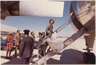 | Keywords: Photograph of Betty Ford Entering her Convair ^816 Aircraft at the Air National Guard Facility at O'Hare Field... - NARA - 186770.tif This photograph depicts Betty Ford smiling while walking up steps to the airplane Also visible are a propeller in the foreground; limousines in the background; and First Lady staff member Nancy Howe military personnel and secret service at the bottom of the steps General notes 186770 Local identifier GRF-WHPO-A0982 9 President 1974-1977 Ford White House Photographic Office 1974 - 1977 Schumacher Karl H Photographer 8451339 <br /> Institution Gerald R Ford Presidential Library Gerald R Ford Library NLGRF 1000 Beal Avenue Ann Arbor MI 48109-2114 1974-09-24 Record group Collection GRF-WHPO White House Photographic Office Collection Ford Administration 12/06/1973 - 01/20/1977 Record group ARC 1136 Gerald R Ford White House Photographs compiled 08/09/1974 - 01/20/1977 Series ARC 1756311 File unit File unit ARC Variant control numbers NAIL Control Number NLF-WHPO-A-A0982 9 yes Other versions Gerald R Ford Presidential Library and Museum-cooperation PD-USGov Betty Ford Images of Betty Ford at the Ford Library and Museum Convair 580 Aircraft at O'Hare International Airport Gerald R Ford Presidential Library and Museum series Gerald R Ford White House Photographs compiled 08/09/1974 - 01/20/1977 |