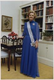 | Keywords: Photograph of First Lady Betty Ford Posing in the Second Floor East Sitting Room of the White House - NARA - 186839.tif This photograph depicts First Lady Betty Ford wearing a purple gown with a light blue sash and a gold star pin on her left lapel Her right hand is on the chair Bookcases are to the left and rear of Mrs Ford General notes 186839 Local identifier GRF-WHPO-B2780 9A President 1974-1977 Ford White House Photographic Office 1974 - 1977 Thomas Ricardo White House photographer Photographer 8464655 <br /> Institution Gerald R Ford Presidential Library Gerald R Ford Library NLGRF 1000 Beal Avenue Ann Arbor MI 48109-2114 1977-01-13 Record group Collection GRF-WHPO White House Photographic Office Collection Ford Administration 12/06/1973 - 01/20/1977 Record group ARC 1136 Gerald R Ford White House Photographs compiled 08/09/1974 - 01/20/1977 Series ARC 1756311 File unit File unit ARC Variant control numbers NAIL Control Number NLF-WHPO-A-B2780 9A yes Other versions Gerald R Ford Presidential Library and Museum-cooperation PD-USGov Personality rights Betty Ford People and bookshelves Rooms in the White House White House in 1977 Blue dresses Sashes Gerald R Ford Presidential Library and Museum series Gerald R Ford White House Photographs compiled 08/09/1974 - 01/20/1977 1970s dresses |