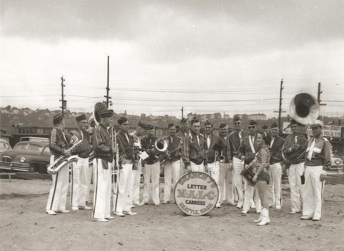 | Keywords: smithsonian institution smithsonianinstitution band music 1950s seattle marching washington postal workers letter carriers mail drum uniform brass majorette malc national association of letter carriers' (nalc) band nationalassociationoflettercarriersnalcband early band camp earlybandcamp tuba branch 78 branch78 group national postal museum nationalpostalmuseum outdoor monochrome Date: c. 1952 Object number: A.2009-43 Medium: paper; photo-emulsion Description: Unidentified members of the National Association of Letter Carriers' (NALC) band pose for a group photograph. As noted on the drum in the center of the photograph, these carriers belonged to Seattle, Washington's Branch 79 of the NALC. The US postal system has a long history of employees forming sports teams, bands, and choirs, the first of which began forming in the late nineteenth century. National Postal Museum, Curatorial Photographic Collection Photographer: Unknown Place: United States of America      Washington See more items in: National Postal Museum Collection Credit line: National Postal Museum, Curatorial Photographic Collection Photographer: Unknown Persistent URL:http://www.arago.si.edu/index.asp?con=2&cmd=1&id=207607 Repository:National Postal Museum View more collections from the Smithsonian Institution. Date: c. 1952 Object number: A.2009-43 Medium: paper; photo-emulsion Description: Unidentified members of the National Association of Letter Carriers' (NALC) band pose for a group photograph. As noted on the drum in the center of the photograph, these carriers belonged to Seattle, Washington's Branch 79 of the NALC. The US postal system has a long history of employees forming sports teams, bands, and choirs, the first of which began forming in the late nineteenth century. National Postal Museum, Curatorial Photographic Collection Photographer: Unknown Place: United States of America Washington See more items in: National Postal Museum Collection Credit line: National Postal Museum, Curatorial Photographic Collection Photographer: Unknown Persistent URL:http://www.arago.si.edu/index.asp?con=2&cmd=1&id=207607 Repository:National Postal Museum View more collections from the Smithsonian Institution. |