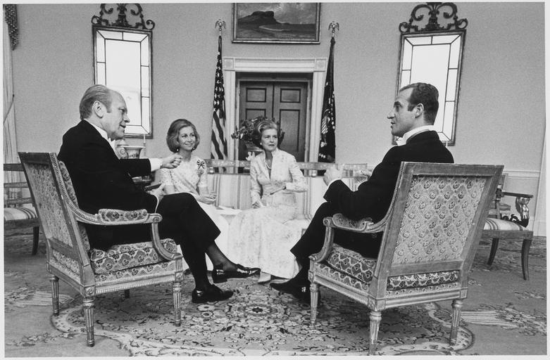 Keywords: Photograph of President Gerald Ford, First Lady Betty Ford, King Juan Carlos I, and Queen Sophia Chatting in the... - NARA - 186832.tif en This photograph depicts President Gerald Ford and King Juan Carlos I with their backs partially towards camera and First Lady Betty Ford and Queen Sophia facing the camera in the Second Floor Yellow Oval Room This photograph was taken prior to going downstairs to greet guests attending the State Dinner held in honor of the Spanish monarchs Gerald Ford la reina de España Sofía la primera dama Betty Ford y el rey de España Juan Carlos durante una visita oficial de los monarcas españoles en la sala oval amarilla de la segunda planta de la Casa Blanca el 20 de junio de 1976 Posteriormente anfitriones e invitados bajaron para celebrar una cena de Estado en honor de los monarcas españoles General notes 186832 Local identifier GRF-WHPO-B0071 17A President 1974-1977 Ford White House Photographic Office 1974 - 1977 Thomas Ricardo White House photographer Photographer 8464655 <br /> Institution Gerald R Ford Presidential Library Gerald R Ford Library NLGRF 1000 Beal Avenue Ann Arbor MI 48109-2114 1976-06-20 Record group Collection GRF-WHPO White House Photographic Office Collection Ford Administration 12/06/1973 - 01/20/1977 Record group ARC 1136 Gerald R Ford White House Photographs compiled 08/09/1974 - 01/20/1977 Series ARC 1756311 File unit File unit ARC Variant control numbers NAIL Control Number NLF-WHPO-A-B0071 17A yes Other versions Gerald R Ford Presidential Library and Museum-cooperation PD-USGov Spain during Cold War People in 1976 Betty and Gerald Ford Juan Carlos I of Spain with national leaders Juan Carlos I of Spain in 1976 Queen Sofía of Spain Yellow Oval Room White House in 1976 People in conversation Gerald R Ford Presidential Library and Museum series Gerald R Ford White House Photographs compiled 08/09/1974 - 01/20/1977 |