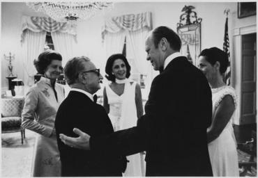 | Keywords: Photograph of President and Mrs. Ford chatting with President and Mrs. Giovanni Leone in the Yellow Oval Room at the... - NARA - 186771.tif This photograph depicts President Gerald Ford and Italian President Leone in foreground with their backs to camera as an interpreter looks on Three women Betty Ford Mrs Leone and an interpreter are facing the camera All are in formal wear as the meeting took place prior to a state dinner held in honor of the Italian President General notes 186771 Local identifier GRF-WHPO-A1012 10A President 1974-1977 Ford White House Photographic Office 1974 - 1977 Kennerly David Hume 1947- Photographer 1312484 <br /> Institution Gerald R Ford Presidential Library Gerald R Ford Library NLGRF 1000 Beal Avenue Ann Arbor MI 48109-2114 1974-09-25 Record group Collection GRF-WHPO White House Photographic Office Collection Ford Administration 12/06/1973 - 01/20/1977 Record group ARC 1136 Gerald R Ford White House Photographs compiled 08/09/1974 - 01/20/1977 Series ARC 1756311 File unit File unit ARC Variant control numbers NAIL Control Number NLF-WHPO-A-A1012 10A yes Other versions Gerald R Ford Presidential Library and Museum-cooperation PD-USGov Betty and Gerald Ford Giovanni Leone People in conversation Yellow Oval Room Gerald R Ford Presidential Library and Museum series Gerald R Ford White House Photographs compiled 08/09/1974 - 01/20/1977 |