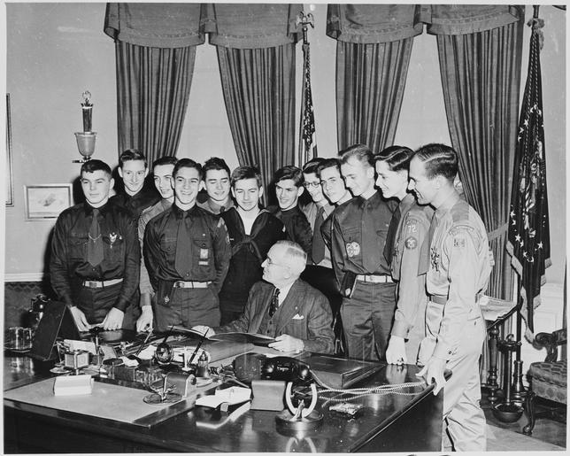 Keywords: Photograph of President Truman with a group of twelve Boy Scouts who have achieved the status of Eagle Scout, in the... - NARA - 200184.tif Scope and content General notes 200184 Local identifier National Archives and Records Administration Office of Presidential Libraries Harry S Truman Library 04/01/1985 - NARA-Author Rowe Abbie 1905-1967 Photographer 8451352 <br /> Harry S Truman Library NLHST 500 West U S Highway 24 Independence MO 64050-1798 1950-02-08 Record group Collection HST-AVC Audiovisual Collection 1957 - 2006 Record group ARC 1207 Photographs Relating to the Administration Family and Personal Life of Harry S Truman compiled 1957 - 2004 documenting the period 1849 - 2004 Series ARC 198606 File unit File unit ARC Variant control numbers NAIL Control Number NLT-AVC-PHT- 73 3252 yes Other versions <gallery> File Photograph_of_President_Truman_with_a_group_of_twelve_Boy_Scouts_who_have_achieved_the_status_of_Eagle_Scout _in_the _-_NARA_-_200184 tif tif File Photograph_of_President_Truman_with_a_group_of_twelve_Boy_Scouts_who_have_achieved_the_status_of_Eagle_Scout _in_the _-_NARA_-_200184 jpg jpg </gallery> NARA-cooperation PD-USGov NARA TIF images with categorized JPGs Black and white photographs February 1950 in the United States Harry S Truman in 1950 White House in 1950 Children in the Oval Office Eagle Scouts Harry S Truman in the Oval Office Smiling men Photographs by Abbie Rowe Black and white photographs of people Photographs taken on 1950-02-08 |