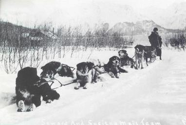 | Keywords: smithsonian institution smithsonianinstitution alaska mail transportation dog team dogteam sled seward snow post card postcard postal history postalhistory louis h. pedersen louishpedersen snow mountain snowmountain sleigh dogs pack 1913 cold winter mountain sled dogs sleddogs mushing musher idid ididarod mail across the commons mailacrossthecommons national postal museum nationalpostalmuseum outdoor sport blackandwhite black and white Date: 1913 Object number: A.2009-35 Medium: postcard stock; photo-emulsion Description: An unidentified mail contractor and his dog sled team on this photographic postcard are pictured at rest while moving a load of mail between Seward (on the Kenai Peninsula) and Susitna, Alaska, a few miles northwest of Anchorage. Dog sleds transported mail in some areas of the northern United States and the Alaskan Territory during winter months. Contract carriers used these sleds across Alaska from the late nineteenth century into the early 1920s. Isolated for much of the year, remote populations sometimes relied on dog sleds for contact with the outside world. Because weight was a critical factor for the dogs, mail traveling on sleds was usually restricted to first-class pieces unless room was available for newspapers, magazines, and packages. These items were otherwise left behind until spring, when they might be transported by steamboat or wagon. National Postal Museum, Curatorial Photographic Collection Photographer: Louis H. Pedersen Place: United States of America      Alaska See more items in: National Postal Museum Collection Credit line: National Postal Museum, Curatorial Photographic Collection Photographer: Louis H. Pedersen Persistent URL:http://www.arago.si.edu/index.asp?con=2&cmd=1&id=207599 Repository:National Postal Museum View more collections from the Smithsonian Institution. Date: 1913 Object number: A.2009-35 Medium: postcard stock; photo-emulsion Description: An unidentified mail contractor and his dog sled team on this photographic postcard are pictured at rest while moving a load of mail between Seward (on the Kenai Peninsula) and Susitna, Alaska, a few miles northwest of Anchorage. Dog sleds transported mail in some areas of the northern United States and the Alaskan Territory during winter months. Contract carriers used these sleds across Alaska from the late nineteenth century into the early 1920s. Isolated for much of the year, remote populations sometimes relied on dog sleds for contact with the outside world. Because weight was a critical factor for the dogs, mail traveling on sleds was usually restricted to first-class pieces unless room was available for newspapers, magazines, and packages. These items were otherwise left behind until spring, when they might be transported by steamboat or wagon. National Postal Museum, Curatorial Photographic Collection Photographer: Louis H. Pedersen Place: United States of America Alaska See more items in: National Postal Museum Collection Credit line: National Postal Museum, Curatorial Photographic Collection Photographer: Louis H. Pedersen Persistent URL:http://www.arago.si.edu/index.asp?con=2&cmd=1&id=207599 Repository:National Postal Museum View more collections from the Smithsonian Institution. |