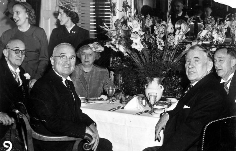 | Keywords: nara:arcid=6233764 u.s. national archives usnationalarchives harry s. truman library harrystrumanlibrary inaugural luncheon inauguralluncheon 1949 1940's 1940s harry s. truman harrystruman marian barkley truitt marianbarkleytruitt albein barkley albeinbarkley bess truman besstruman margaret truman margarettruman people groupshot blackandwhite monochrome black and white Original Caption: Photograph of the Trumans and Barkleys at an Inaugural Luncheon, ca. 01/20/1949 Created By: National Archives and Records Administration. Office of Presidential Libraries. Harry S. Truman Library. (04/01/1985 - ) From: Series: Photographs Relating to the Administration, Family, and Personal Life of Harry S. Truman, compiled 1957 - 2004, documenting the period 1849 - 2004 Contact: Harry S. Truman Library (NLHST), 500 West U.S. Highway 24, Independence, MO, 64050-1798. PHONE: 816-268-8272; FAX: 816-268-8295; EMAIL:truman.reference@nara.gov. Production Dates: ca. 01/20/1949 Scope and Content Note: President Harry S. Truman and Vice President Alben Barkley at lunch during inauguration festivities. Standing: Margaret Truman, Mrs. Marian Barkley Truitt. Seated, left to right: Unidentified man, President Truman, Mrs. Bess Wallace Truman, Vice President Barkley, and unidentified man. Persistent URL: arcweb.archives.gov/arc/action/ExternalIdSearch?id=6233764 Truman Library URL: www.trumanlibrary.org/photographs/view.php?id=2829&rr= Access Restrictions: Unrestricted Use Restrictions: Unrestricted Original Caption: Photograph of the Trumans and Barkleys at an Inaugural Luncheon, ca. 01/20/1949 Created By: National Archives and Records Administration. Office of Presidential Libraries. Harry S. Truman Library. (04/01/1985 - ) From: Series: Photographs Relating to the Administration, Family, and Personal Life of Harry S. Truman, compiled 1957 - 2004, documenting the period 1849 - 2004 Contact: Harry S. Truman Library (NLHST), 500 West U.S. Highway 24, Independence, MO, 64050-1798. PHONE: 816-268-8272; FAX: 816-268-8295; EMAIL:truman.reference@nara.gov. Production Dates: ca. 01/20/1949 Scope and Content Note: President Harry S. Truman and Vice President Alben Barkley at lunch during inauguration festivities. Standing: Margaret Truman, Mrs. Marian Barkley Truitt. Seated, left to right: Unidentified man, President Truman, Mrs. Bess Wallace Truman, Vice President Barkley, and unidentified man. Persistent URL: arcweb.archives.gov/arc/action/ExternalIdSearch?id=6233764 Truman Library URL: www.trumanlibrary.org/photographs/view.php?id=2829&rr= Access Restrictions: Unrestricted Use Restrictions: Unrestricted |