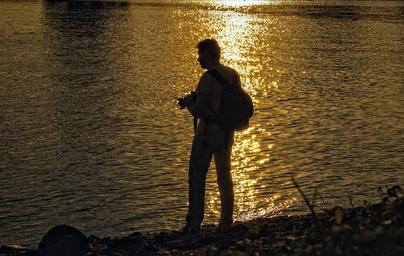 Keywords: photographer camera water bank sunset gold mood evening sun