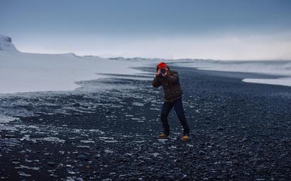 Keywords: photographer person taking picture camera snow ice cold antarctica professional lifestyle travel adventure beach pebbly stones