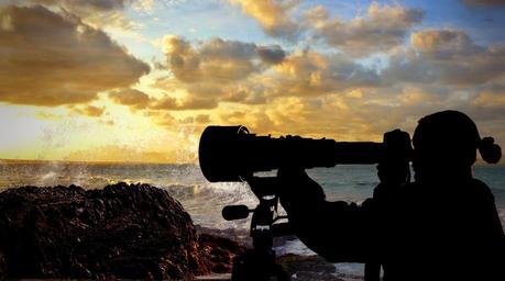 Keywords: photographer photography camera lens zoom zoom lens microphone search woman female girl evening sky silhouette light professional professional photographer surf rock sea water clouds landscape nature