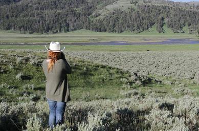 Keywords: photographing wildlife outdoors yellowstone national park wyoming usa visitor tourist grizzly bear woman female nature camera photography recreation hobby landscape scenic