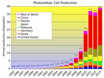 | Keywords: Photovoltaics cell production.svg translate yes en Photovoltaic cell manufacturing production from 1995-2013 Data source is http //www iea-pvps org/fileadmin/dam/public/report/statistics/IEA_PVPS_Trends_2014_in_PV_Applications_-_lr pdf IEA-PVPS pg 44 and http //www earth-policy org/datacenter/xls/indicator12_2013_2 xlsx Earth Policy Institute 2014-11-12 own Delphi234 other versions Largest Producers of Solar Cells by Country-Market Share svg current annually cc-zero Uploaded with UploadWizard Photovoltaic power statistics |