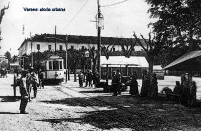 Keywords: Vista di piazza Mercato (odierna piazza Repubblica). Sullo sfondo la caserma Garibaldi (arch. Silvio Spinelli, 1861). tram varese casermagaribaldi