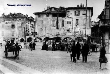 | Keywords: Primi lavori a piazza Monte Grappa. A sinistra non esiste più casa Cova (demolita per fare spazio al palazzo R.A.S. progettato dall' ing. Mario Loreti). Dopo corso Vittorio Emanuele II (ora corso Matteotti) si sta completando l'abbattimento dell'antica casa, di cui si vede ancora il lungo porticato su capitelli tardo gotici, sostituita da palazzo Mascardi/Pini ('ing. Camillo Lucchina, 1929). All'estrema destra i fregi dell'angolo di casa Romanò (sostituita dall'edificio che ospita un grande magazzino nel 1960). varese piazzamontegrappa |