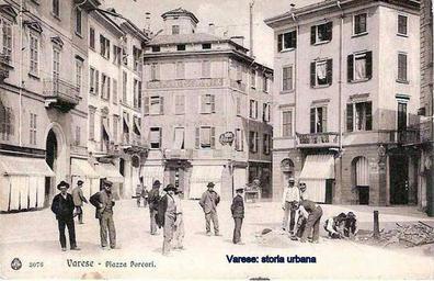 | Keywords: varese piazza porcari piazzaporcari via verbano viaverbano via walter marcobi viawaltermarcobi corso vittorio emanuele ii corsovittorioemanueleii corso giacomo matteotti corsogiacomomatteotti piazza monte grappa piazzamontegrappa architecture building road outdoor All'estrema sinistra casa Carantani già casa Porcari (rimodernata nel 1809 dall'arch. Lorenzo Zuccotti). L'edificio con torretta che ospita la cappelleria e reca l'insegna pubblicitaria dell'hotel Europa di via Sacco verrà demolito nel 1928 per fare spazio a palazzo Verga (ing. Mario Cantù). Tra questo palazzo e casa Cova (a destra, sostituito dal palazzo R.A.S., ing. Mario Loreti, 1935) è la strettissima via Verbano (ora Marcobi). A destra di casa Cova l'imbocco di corso Vittorio Emanuele II (ora Matteotti). All'estrema sinistra casa Carantani già casa Porcari (rimodernata nel 1809 dall'arch. Lorenzo Zuccotti). L'edificio con torretta che ospita la cappelleria e reca l'insegna pubblicitaria dell'hotel Europa di via Sacco verrà demolito nel 1928 per fare spazio a palazzo Verga (ing. Mario Cantù). Tra questo palazzo e casa Cova (a destra, sostituito dal palazzo R.A.S., ing. Mario Loreti, 1935) è la strettissima via Verbano (ora Marcobi). A destra di casa Cova l'imbocco di corso Vittorio Emanuele II (ora Matteotti). |