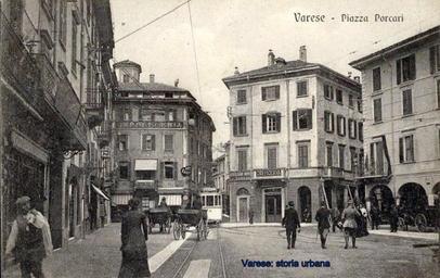 | Keywords: varese tram piazza porcari piazzaporcari via verbano viaverbano via walter marcobi viawaltermarcobi corso vittorio emanuele ii corsovittorioemanueleii corso giacomo matteotti corsogiacomomatteotti piazza monte grappa piazzamontegrappa road architecture building outdoor Sulla sinistra l'edificio con i due balconi è casa Carantani già casa Porcari (rimodernata nel 1809 dall'arch. Lorenzo Zuccotti). L'edificio con torretta che ospita la cappelleria e reca l'insegna pubblicitaria dell'hotel Europa di via Sacco verrà demolito nel 1928 per fare spazio a palazzo Verga (ing. Mario Cantù). Tra questo palazzo e casa Cova (all'estrema destra, sostituito dal palazzo R.A.S., ing. Mario Loreti, 1935) è la strettissima via Verbano (ora Marcobi). A destra di casa Cova l'imbocco di corso Vittorio Emanuele II (ora Matteotti) con la casa porticata sostituita nel 1929 da palazzo Mascardi/Pini (ing. Camillo Lucchina). Sulla sinistra l'edificio con i due balconi è casa Carantani già casa Porcari (rimodernata nel 1809 dall'arch. Lorenzo Zuccotti). L'edificio con torretta che ospita la cappelleria e reca l'insegna pubblicitaria dell'hotel Europa di via Sacco verrà demolito nel 1928 per fare spazio a palazzo Verga (ing. Mario Cantù). Tra questo palazzo e casa Cova (all'estrema destra, sostituito dal palazzo R.A.S., ing. Mario Loreti, 1935) è la strettissima via Verbano (ora Marcobi). A destra di casa Cova l'imbocco di corso Vittorio Emanuele II (ora Matteotti) con la casa porticata sostituita nel 1929 da palazzo Mascardi/Pini (ing. Camillo Lucchina). |