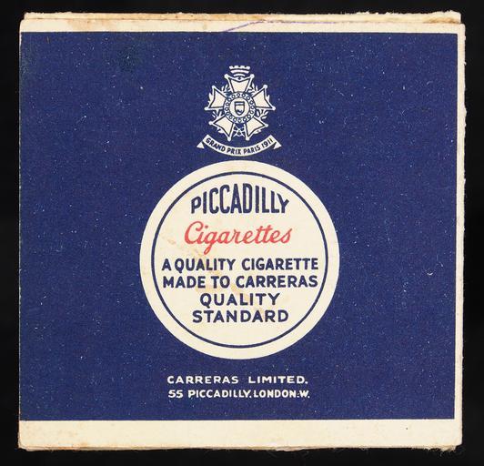 Keywords: Piccadilly cigarettes pack, back.JPG Very old packaging of a product that is not produced and not sold any more own 2014-04-13 10 43 09 Alf van Beem CC-Zero Trademarked Piccadilly cigarettes Cigarette packs