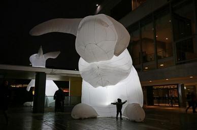 | Keywords: hug rabbit public art publicart London, UK Large inflatable rabbit sculptures form part of the Southbank Centreâs Winter Festival. The seven metre high inflatable sculptures by Australian artist Amanda Parer entitled Intrude will be on display until January 11, 20 London, UK Large inflatable rabbit sculptures form part of the Southbank Centreâs Winter Festival. The seven metre high inflatable sculptures by Australian artist Amanda Parer entitled Intrude will be on display until January 11, 20 |