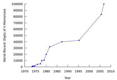 | Keywords: PiDigits.svg Recent decades have seen a surge in the record number of digits memorized Created with Gnuplot from the following data supplied by User Mebden Around 1973 5 930 1973 81 1110 1973 95 1210 1974 5 1505 1975 93 4095 1977 3 5050 1978 10000 1979 10625 1980 20015 1981 6 31810 1987 3 40000 1995 2 42195 2005 6 83430 2006 81 100000 2008 91 120539 en wikipedia Andrei Stroe CommonsHelper 2007-08-09 Keenan Pepper wikipedia en Keenan Pepper original upload log page en wikipedia PiDigits svg 2007-08-09 17 28 Keenan Pepper 640×440× 134704 bytes <nowiki>Convert all text objects to paths in Inkscape which makes pi symbol render correctly </nowiki> 2007-08-09 17 23 Keenan Pepper 640×440× 6901 bytes <nowiki> Created with Gnuplot from the following data supplied by User Mebden 1973 5 930 1973 81 1111 1973 95 1210 1974 5 1505 1975 93 4096 1977 3 5050 1978 10000 1979 10625 1980 20013 1981 6 31811 1987 3 40000 1995 2 42195 2005 6 8</nowiki> Memorizing Pi English text |