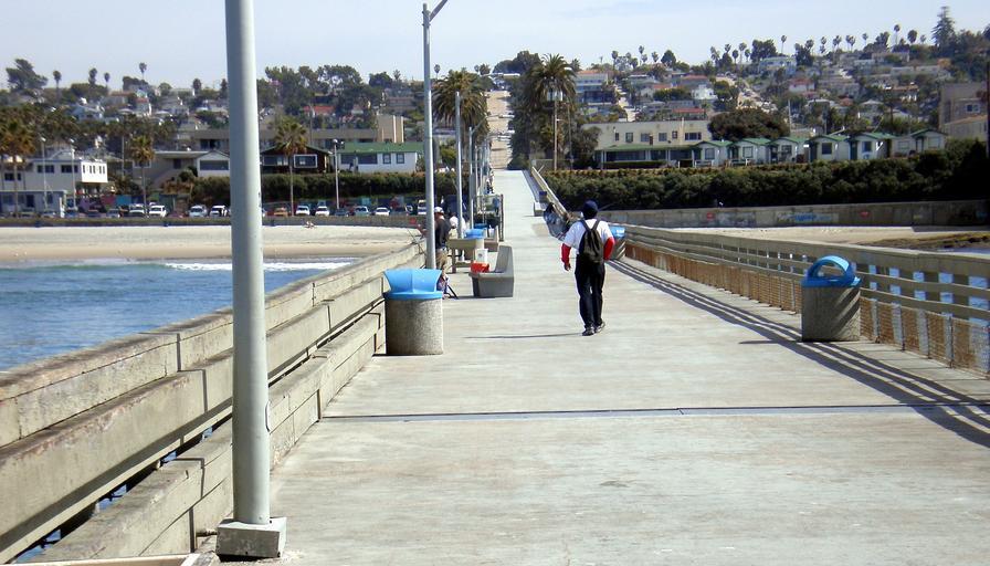 Keywords: pier ocean dock skyline building walk walker lamp pole sky man