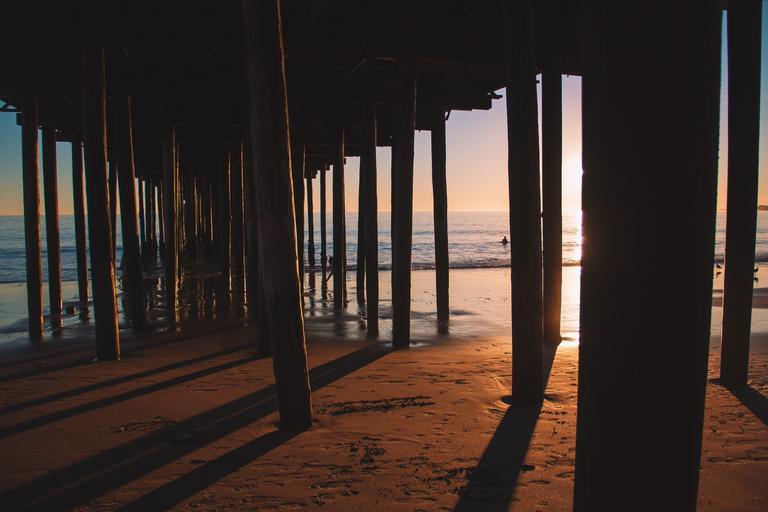 Keywords: pier wooden jetty underneath sunset sunrise shadows ocean sea beach poles posts construction summer