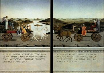 | Keywords: Piero, Double portrait of the Dukes of Urbino 04.jpg Artwork Creator Piero della Francesca Die Triumphzüge des Federico da Montefeltro und der Battista Sforza en The Triumphs of Federico da Montefeltro and Battista Sforza Les Triomphes de Federico da Montefeltro et de Battista Sforza I Trionfi di Federico da Montefeltro e di Battista Sforza 1472 Oil Wood cm 47 33 Institution Uffizi Florence Federigo da Montefeltre Herzog von Urbino Rückseiten eines Diptychons vgl Pendantporträts des Herzogs und seiner Frau auf der Vorderseite www wga hu PD-old-100 Other versions <gallery> File Piero della Francesca 047 jpg File Piero della Francesca 047 jpg File Piero Double portrait of the Dukes of Urbino 06 jpg File Piero Double portrait of the Dukes of Urbino 06 jpg File Piero Double portrait of the Dukes of Urbino 05 jpg File Piero Double portrait of the Dukes of Urbino 05 jpg File Piero Double portrait of the Dukes of Urbino landscape continuation jpg File Piero Double portrait of the Dukes of Urbino landscape continuation jpg </gallery> Double portrait of the Dukes of Urbino R0 Chariots in paintings Reverses of paintings Oil paintings of horses Piero della Francesca Trionfi dei duchi di Urbino 00 Oil paintings of unicorns Piero della Francesca Trionfi dei duchi di Urbino 00 Images from Web Gallery of Art Category WGA form painting WGA type portrait WGA School Italian WGA time period 1451-1500 1460s portrait paintings |