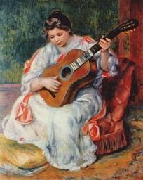 | Keywords: Pierre-Auguste Renoir 043.jpg Artwork Creator Pierre-Auguste Renoir de Gitarrespielerin oil on canvas cm 81 65 Institution Musée des Beaux-Arts de Lyon Lyon France Yorck ca 1896-1897 http //mail wikipedia org/pipermail/wikide-l/2005-April/012195 html Other versions 150px PD-old-auto 1919 PD-Art-YorckProject DEFAULTSORT 1896-1897; Pierre-Auguste Renoir 1890s oil on canvas paintings in France 19th-century oil portraits of sitting women at full length Arms in art French paintings in the Musée des Beaux-Arts de Lyon Guitarists in art Impressionist paintings in the Musée des Beaux-Arts de Lyon Impressionist paintings of musicians Paintings by Pierre-Auguste Renoir in France guitare Paintings of sitting women playing musical instruments indoors Paintings of women by Pierre-Auguste Renoir People in three-quarter views in art Temporary for Cat-a-lot - Female humans Eye “hand coordination |