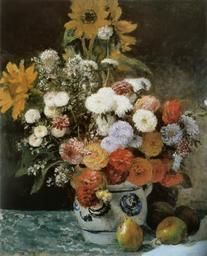 | Keywords: Pierre-Auguste Renoir - Fleurs dans un pot en faïence.jpg ca 1869 Oil paperboard canvas cm 64 8 54 3 Institution Museum of Fine Arts Boston accession number 48 592 object history credit line bottom right Renoir Renoir peintre du bonheur 1841-1919 de Gilles Néret Köln Taschen 2001 p 31 ISBN 9783822857410 PD-old-auto 1919 Still life paintings by Pierre-Auguste Renoir Still life paintings of flowers Still life paintings of fruits 1860s paintings in the United States Paintings by Pierre-Auguste Renoir in the United States Taken with Panasonic Lumix DMC-TZ2 Paintings by Auguste Renoir in the Museum of Fine Arts Boston 1860s still-life paintings |