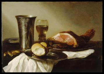 | Keywords: Pieter Claesz - Breakfast Piece - Walters 371984.jpg Walters Art Museum artwork Q18749345 Creator Pieter Claesz In the 1600s ham bread and white wine were often eaten at breakfast as well as at lunch The use of simple pewter indicates that this is an everyday meal The angle at which we view the composition encourages us to think that the scene is an extension of our own space and that we are seated close by while the dish balanced precariously on the table's edge engages our attention by making us think that it might fall Pieter Claesz and his followers developed this popular subject during the 1630's and 1640's between 1640 1649 Baroque oil on panel cm 39 6 55 8 accession number 37 1984 40049 Henry Walters Baltimore date and mode of acquisition unknown Walters Art Museum Henry Walters Acquired by Henry Walters New Light on Old Pictures Dutch and Flemish Paintings from the Walters The Walters Art Gallery Baltimore 1981-1982 Artful Dining The Exhibition The Walters Art Gallery Baltimore 1994 place of origin Haarlem Netherlands Walters Art Museum license 2D Baroque paintings in the Walters Art Museum Paintings by Pieter Claesz 17th-century still life paintings in the United States 1640s paintings in the United States 1640s still life paintings Media contributed by the Walters Art Museum needs artist update Hams in art |