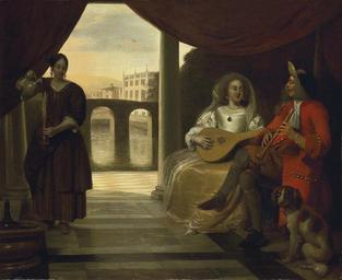 | Keywords: Pieter de Hooch - Elegant couple playing music on a terrace, with a maidservant pouring wine.jpg Artwork creator Pieter de Hooch Title Concert Elegant couple playing music on a terrace with a maidservant pouring wine Elegant musicerend paar op een terras met een dienstmeid die wijn inschenkt 225912 1680-1684 oil on canvas cm 51 2 62 2 private collection object history Genre works P C Sutton Pieter de Hooch Oxford 1980 cat no 155 ; C Hofstede de Groot Beschreibendes und Kritisches Verzeichnis der Werke der Hervorragendsten Hollandischen Maler des XVII Jahrhunderts vol I Paris 1907 cat no 134 http //www christies com/LotFinder/lot_details aspx intObjectID 5910131 Other versions PD-old-100 Genre paintings by Pieter de Hooch Baroque genre paintings Baroque paintings of women 1680s paintings |