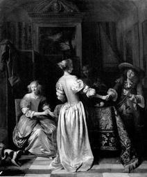 | Keywords: Pieter de Hooch - Merry company in a distinguished interior.jpg Artwork creator Pieter de Hooch Title Merry company in a distinguished interior Interieur met twee pratende vrouwen een man en een hond 17de eeuw na ca 1665 248215 ca 1675 “1677 oil canvas cm 73 62 Washington D C Corcoran 26 103 National Gallery of Art P C Sutton Pieter de Hooch Oxford 1980 cat no 121 ; C Hofstede de Groot Beschreibendes und Kritisches Verzeichnis der Werke der Hervorragendsten Hollandischen Maler des XVII Jahrhunderts vol I Paris 1907 cat no 191 object history Previously in the Corcoran Gallery of Art credit line https //rkd nl/explore/images/248215 Other versions PD-old-100 Genre paintings by Pieter de Hooch 1670s paintings Paintings in the National Gallery of Art |