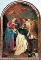 | Keywords: Pieter Thijs (attr.) - St. Dominic receiving the Rosary from the Virgin.jpg Attributed to en St Dominic receiving the Rosary from the Virgin century 17 Sanzsalazar J 2009 Una nueva pintura de Peter Thijs identificada en la Colegiata de Santa Gertrudis de Nivelles Valonia Archivo Español de Arte 82 325 79-86 Oil canvas cm 260 190 Collégiale Sainte-Gertrude Nivelles Belgium Other versions PD-old-100 History and allegorical paintings by Pieter Thijs Interior of église Sainte-Gertrude Nivelles Baroque paintings of Virgin Mary 17th-century paintings of Christian saints |
