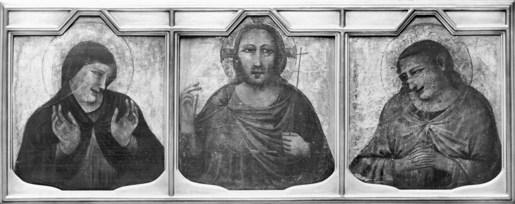| Keywords: Pietro da Rimini - The Blessing Christ, the Mourning Virgin, the Mourning St John the Evangelist - Walters 37634.jpg  Walters Art Museum artwork Creator Pietro da Rimini These fragments originally adorned a monumental crucifix The Blessing Christ would have appeared at the top while Mary and John the Evangelist would have occupied the left and right ends of the cross's horizontal beam Pietro da Rimini imitated the naturalistic figural style of Giotto the famed Florentine painter but also excelled at combining dazzling colors and stylized expressions for dramatic effect The exaggerated facial features of Pietro da Rimini's figures ensured that their expressions would be comprehensible even when suspended high above the floor In a recent innovation that demanded the worshiper's imagination the open mouths of Mary and St John suggest the sound of their lamentation For more information on these fragments please see Zeri catalogue number 36 pp 60-61 between 1340 1349 Medieval tempera tooled gold panel Christ painted surface cm 45 3 41 2 3 8 ; The Virgin painted surface cm 43 7 40 3 2 ; St John painted surface cm 45 4 40 2 3 8 Overall cm 45 24 41 12 accession number 37 634 22647 Don Marcello Massarenti Collection Rome date and mode of acquisition unknown 1881 catalogue no 6 7 and 8 as Cimabue 1897 catalogue no 39 as Giotto Henry Walters city Baltimore Walters Art Museum Henry Walters Acquired by Henry Walters with the Massarenti Collection 1902 place of origin Rimini Italy Walters Art Museum license 3D Medieval art in the Walters Art Museum Pietro da Rimini Paintings in the Walters Art Museum Media contributed by the Walters Art Museum needs category review |