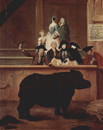 | Keywords: Pietro Longhi 009.jpg Artwork Creator Pietro Longhi de Das Rhinozeros 1751 Oil on canvas cm 62 50 Institution Ca' Rezzonico Venice genre works <br><br>This is a copy of Image Pietro Longhi 1751 rhino jpg In this painting two masked people are replaced by to non-masked persons The unmasked man in the centre is propably Douwe Mout van der Meer the owner of the rhinoceros The poster on the right says Vero Ritratto Di un Rinocerotto condotto in Venetia L'anno 1751 fatto per mano di Pietro Longhi per Commissione del N O Giovanni Grimani dei Servi; Patrisio Veneto A lifelike portrait of a rhinoceros which was brought to Venice in 1751 made by Pietro Longhi for the nobleman Giovanni Grimani dei Servi; Venecian patrician The Yorck Project 10 000 Meisterwerke der Malerei DVD-ROM 2002 ISBN 3936122202 Distributed by DIRECTMEDIA Publishing GmbH http //mail wikipedia org/pipermail/wikide-l/2005-April/012195 html PD-old-100 PD-Art-YorckProject Pietro Longhi - the Rhinoceros Rhinoceros |
