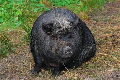 Keywords: pig sit massive pot bellied pig female eat trustful domestic pig