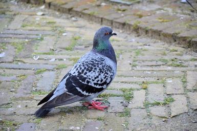 Keywords: pigeon birds blue grey gray plumage feathes wildlife peace symbols isolated alone lands tiles floors grounds outdoors
