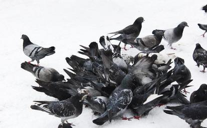 Keywords: pigeons birds blue grey pigeons feathered race wire wild pigeons snow cold winter frost park
