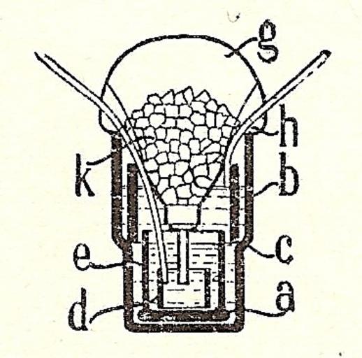 Keywords: Pila de Meidinger.jpg en Meidinger cell copper sulphate cell a Inner jar b Recessed glass jar c Bend shoulder d Sheet-lead cylinder e Solution of sulphate of magnesium g Inverted glass flask bell jar h Seat k Crystals of copper sulphate es Pila de Meidinger pila de sulfato de cobre a Vaso fijo b Vaso de vidrio acodado c Codo d Cilindro de plomo laminado e Disolución de sulfato de magnesia g Globo de vidrio h Superficie de contacto k Sulfato de cobre cristalizado fr Élément de Meidinger au sulfate de cuivre élément à ballon a Vase à sulfate de cuivre b Recipient en verre à redan ou à etranglement c Redan ou étranglement d Cylindre de plomb laminé e Solution de sulfate de magnésie g Ballon de verre h Surface d'appui ou de contact k Cristaux de sulfate de cuivre de Meidinger-Element Ballonelement Sturzelement a Standglas b Gekröpftes Glasgefäß c Kröpfung d Bleiblechzylinder e Magnesiumsulfatlösung Bittersalzlösung g Glasballon h Aufsitzfläche k Kupfervitriolkristall it Pila di Meidinger pila a solfato di rame a Vetro fisso b Recipiente di vetro curvato c Curvatura d Cilindro di lamiera di piombo e Soluzione di solfato di magnesio g Sfera di vetro h Superficie di contatto k Cristallo di solfato di rame Diccionario Técnico Ilustrado Tomo II Electrotecnia Bailly-Baillère é hijos Madrid 1908 p 13 Xosema 1908 PD-old Meidinger cell Images by Xosema |