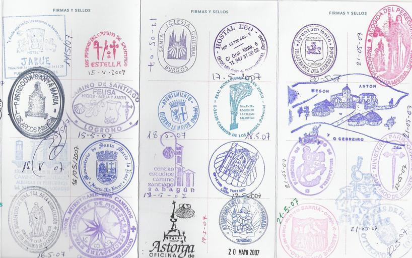 Keywords: Pilgrim Passport2.jpg Picture of stamps in Spain in Way of St James pilgrim passport Scan date June 2007 2007-06-07 own assumed Jane023 Way of Saint James Pilgrim