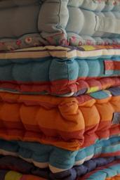 Keywords: pillow stacked pillow stack seat cushions upholstery close colorful