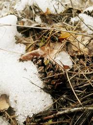 Keywords: pine cone forest sheet nature cones plant brown macro straw stones dry leaves branch grass land dry grass summer leaves spruce needles autumn winter snow thaw under the snow melting snow closeup melancholia trees park woodpecker