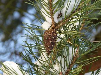 Keywords: pine cones pine tree winter snow nature sky needles road forest tap conifer periwinkle green brown