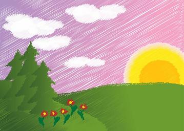 Keywords: pine trees trees sunrise sunset clouds flowers landscape outdoors drawing art sunlight sky evergreen artistic colorful