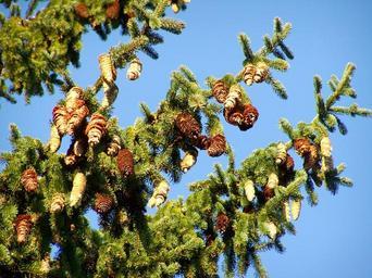 Keywords: pine wood cone crop blue sky