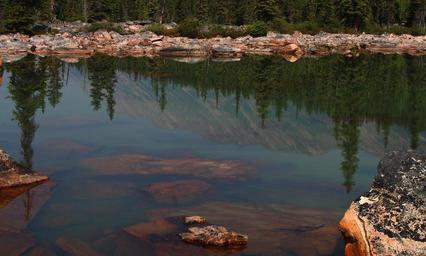 Keywords: pink granite granite rock slide reflection water still water rocks canadian rockies pine trees water reflection rocks in water pink