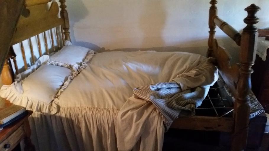 Keywords: I believe this is an original bed from the house (not sure, though). The bottom covers are lifted up to show the construction of the rope weave below. Jacob Hamblin Home, Santa Clara, UT bed rope pioneer