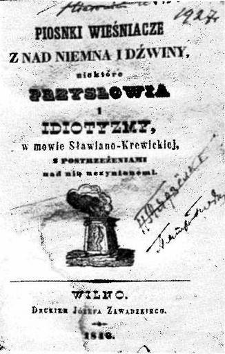 | Keywords: Piosnki wieśniacze znad Dźwiny. Wilno, 1840..jpg en Piosnki wieśniacze znad Dźwiny Wilno 1846 by Jan Czeczot be-tarask Вокладка кнігі ««Сялянскія песенькі з-пад ёмана і Дзьвіны некато ы п ыказкі на славяна-к ывіцкай мове і яе самабытныя словы з назі аньнямі над гэтай мовай»» 1846 году Яна Чачота Бела ускі кнігазбо Чачот Ян ВЫБРА ЫЯ ТВОРЫ / Уклад пе з польскага п адм і камент К Цві кі -- н Ф Бела ускі кнігазбо 1996 Jan Czeczot 1840 Jan Czeczot PD-old-100 | ||||