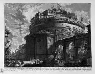 | Keywords: Piranesi-16056.jpg 16 16055 16057 53 it VEDUTA del Mausoleo d' Elio Adriano ora chiamato Castello S Angelo nella parte opposta alla Facciata dentro al Castello A Avanzo del Masso antico B Copertura moderna di mattoni sopra l' antico Masso C Bocche di Artiglieria collocata nel Corritojo che gira all' intorno D Loggia diametralm <sup>te</sup> opposta alla Facciata del Mausoleo E Carceri per le persone riguardevoli F Archivio G Maschietto H Angelo di metallo I Baloardi fatti piantare dal Pontifice Alessandro VI K Corritojo fabbricato parim <sup>te</sup> per ordine dello stesso; e poscia fatto coprire da Urbano VIII Queste Corritojo รจ sostenuto da gran numero d' Archi e dal Palazzo Vaticano conduce sine dentro al Maschio L Ponte levatore del Corritojo M Polveriera N Cordonata la quale porta sopra i Terrapieni e sopra le Mura del principale Recinto del Castello O Recinto di Mura e Baloardi che circonda il Maschio P Armeria Q Abitazione per gli Uffiziali e Soldati R Abra Polveriera 54 4 x 78 9 cm Castel Sant'Angelo Rome in art 1748 Passetto di Borgo |